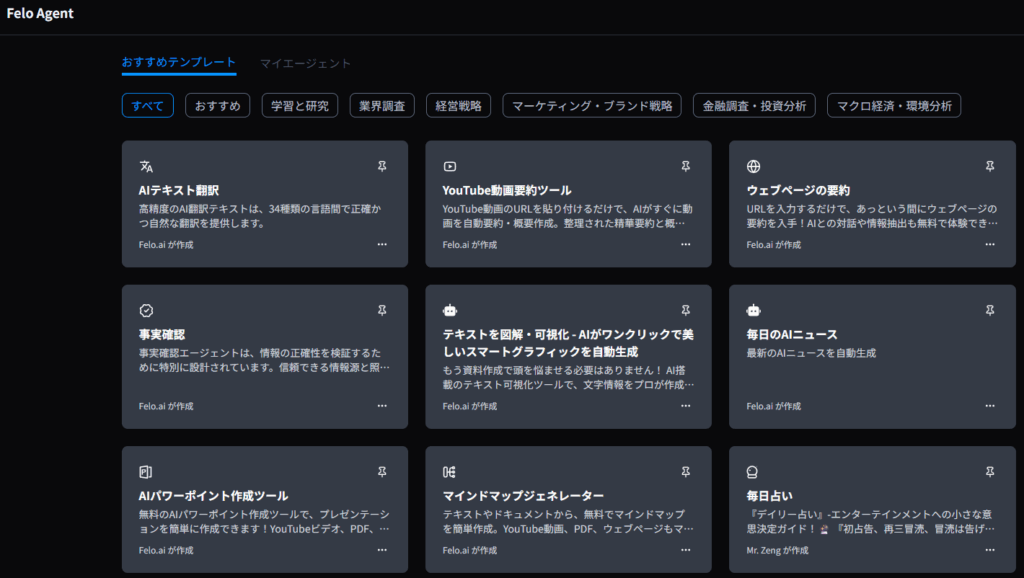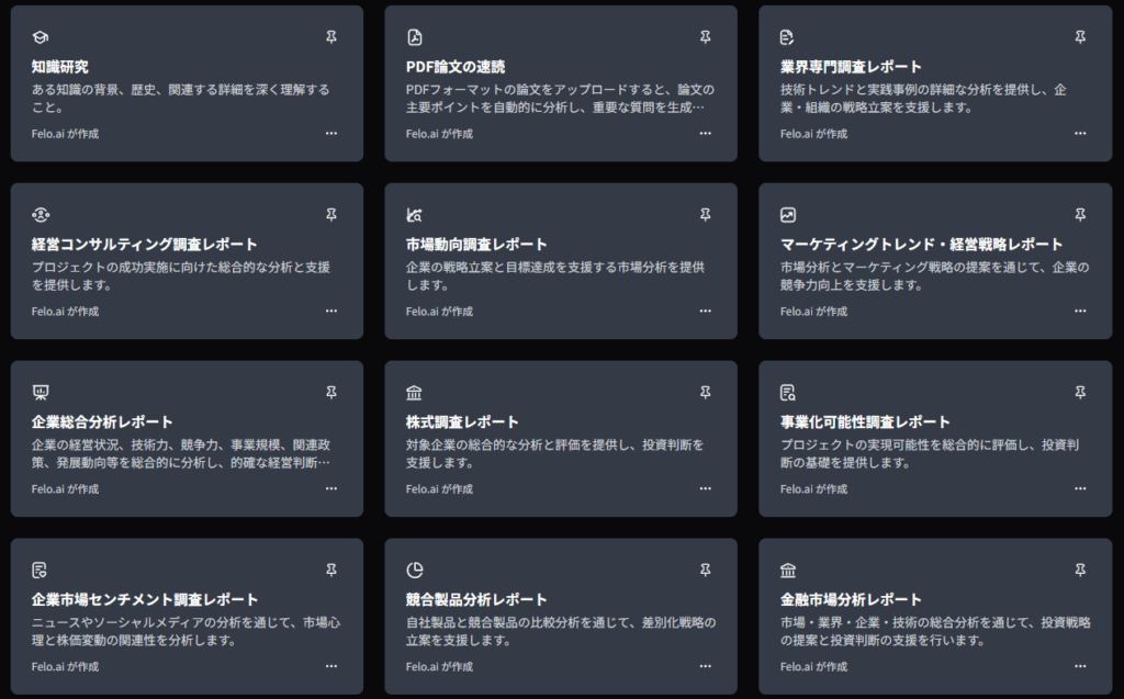 Felo Agentは、利用者の目的に応じて事前に整理されたテンプレートを提供しています。