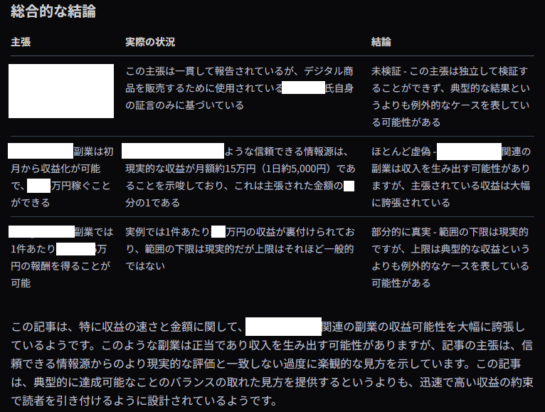 また、このデータの整理と分析では、購入する側の視点で活用する場合、例えば「事実確認」というテンプレートにその情報商材を紹介・レビューしている記事のURLをFeloにインプットするだけで、インターネット上の情報からノウハウの再現性についての調査を行ってくれたりします。