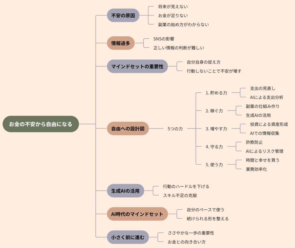 例えば、情報商材のノウハウを再現する際には、そのステップやプロセスを視覚的に整理し、再現性を高めるためのマップを瞬時に生成できます。